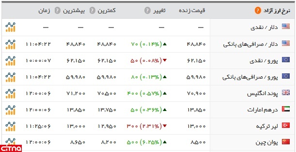 به این ترتیب، هر دلار آمریکا 4884 تومان، یورو 5998 تومان، پوند 7090 تومان، درهم امارات 1385 تومان، لیر ترکیه 1300 تومان و یوان چین 850 تومان بود.