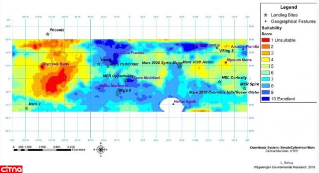 به گزارش ایسنا، به نقل از تک تایمز، محققان "دانشگاه و مرکز تحقیقاتی واخِنینگِن" (Wageningen University and Research) در هلند، برای تعیین بهترین مکان استقرار انسان در سیاره مریخ در آینده، یک نقشه سه بعدی را طراحی کرده اند که مکان های مختلف ایده آل برای زندگی در مریخ را نشان می دهد.