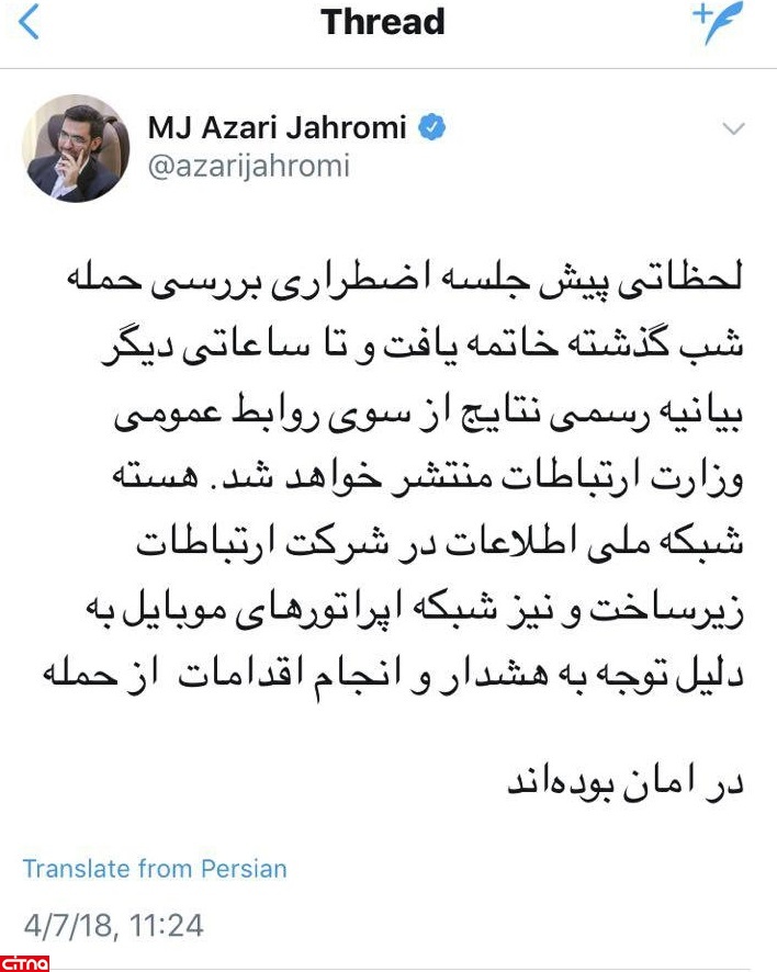 "لحظاتی پیش، جلسه اضطراری بررسی حمله شب گذشته خاتمه یافت و تا ساعاتی دیگر بیانیه رسمی نتایج از سوی روابط عمومی وزارت ارتباطات منتشر خواهد شد. هسته شبکه ملی اطلاعات در شرکت ارتباطات زیرساخت و نیز شبکه اپراتورهای موبایل به دلیل توجه به هشدار و انجام اقدامات از حمله در امان بوده اند."