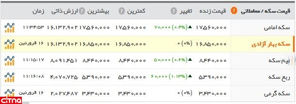 بر این اساس، هر قطعه سکه امامی یک میلیون و 756 هزار تومان، سکه تمام بهار آزادی یک میلیون و 685 هزار تومان، نیمسکه 844 هزار تومان، ربعسکه 539 هزار تومان و سکه یکگرمی 343 هزار تومان فروخته شد.