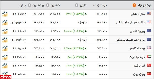 به این ترتیب، در بازار هر دلار آمریکا 5121 تومان، یورو 6325 تومان، پوند 7280 تومان، درهم امارات 1400 تومان، لیر ترکیه 1310 تومان و یوان چین 860 تومان قیمت داشت.