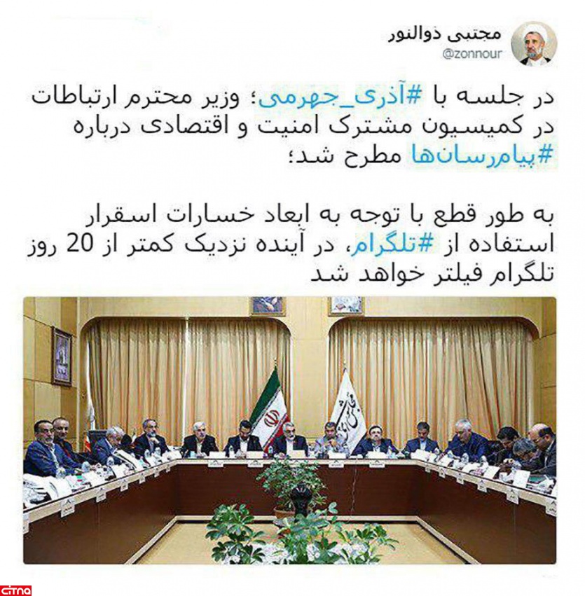در جلسه با آذری جهرمی وزیر ارتباطات، در کمیسیون مشترک امنیت و اقتصادی، درباره پیام رسان ها مطرح شد؛ به طور قطع با توجه به ابعاد خسارات استقرار استفاده از تلگرام در آینده نزدیک کمتر از ۲۰ روز تلگرام فیلتر خواهد شد.