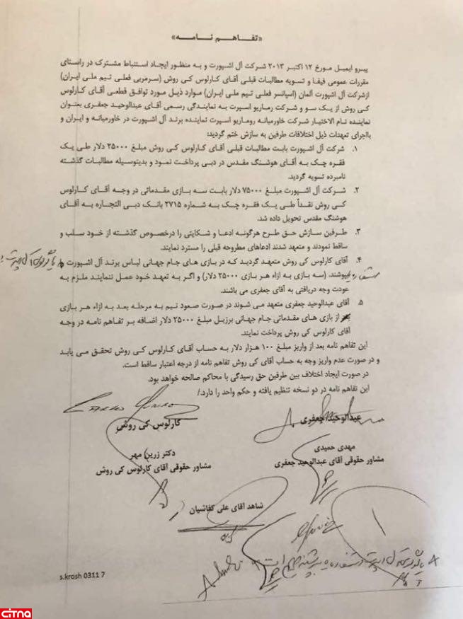 به گزارش سرویس وبگردی سیتنا، متن تصویر تفاهمنامه شرکت آلاشپورت با کیروش به شرح ذیل است: