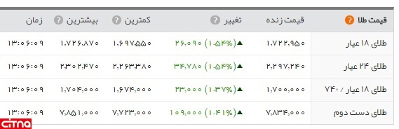 هر گرم طلای 18 عیار امروز 172 هزار و 64 تومان نرخ خورد که 2378 تومان نسبت به ساعات ابتدایی امروز معاملات رشد نشان می دهد. هر مثقال طلا هم با 10 هزار و 300 تومان افزایش 745 هزار و 300 تومان معامله شد.