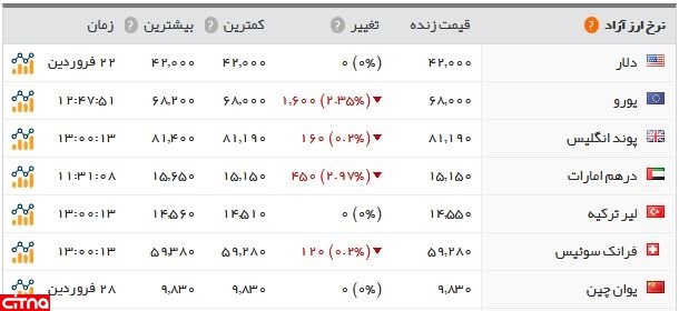 گزارشها نشان میدهد قیمت یورو در بازار آزاد با افت 160 تومانی قیمت، پوند با کاهش 16 تومانی و درهم امارات با افت 45 تومانی مواجه شده است.