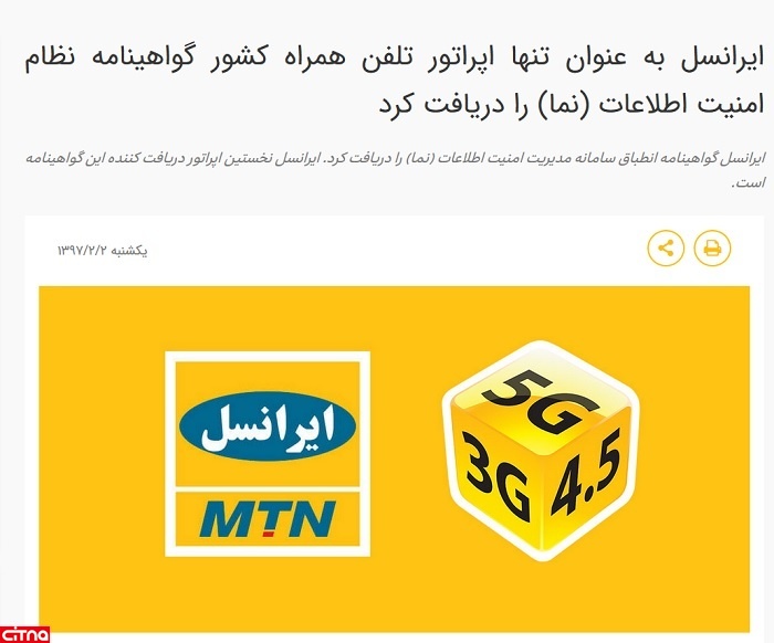 به گزارش خبرنگار سیتنا، روابط عمومی ایرانسل با انتشار خبری اعلام کرده بود که "ایرانسل به عنوان تنها اپراتور تلفن همراه کشور گواهینامه نظام امنیت اطلاعات (نما) را دریافت کرد". در همین راستا، اپراتور اول با رد خبر ایرانسل اعلام کرد که این گواهینامه را چهار سال پیش گرفته است.