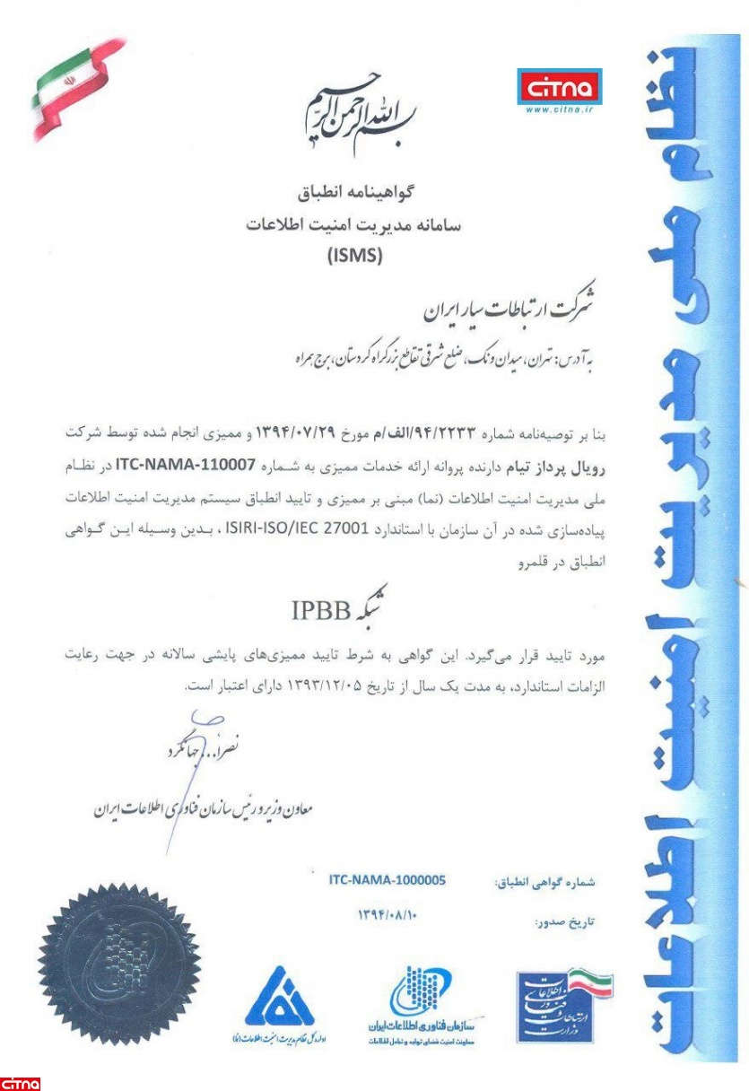 گفتنی است؛ رایتل نیز گواهینامه انطباق سامانه مدیریت امنیت اطلاعات را دو سال قبل از معاون وزیر ارتباطات و فناوری اطلاعات و رئیس سازمان فناوری اطلاعات دریافت کرده است. (لینک)