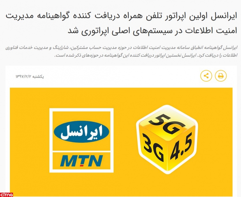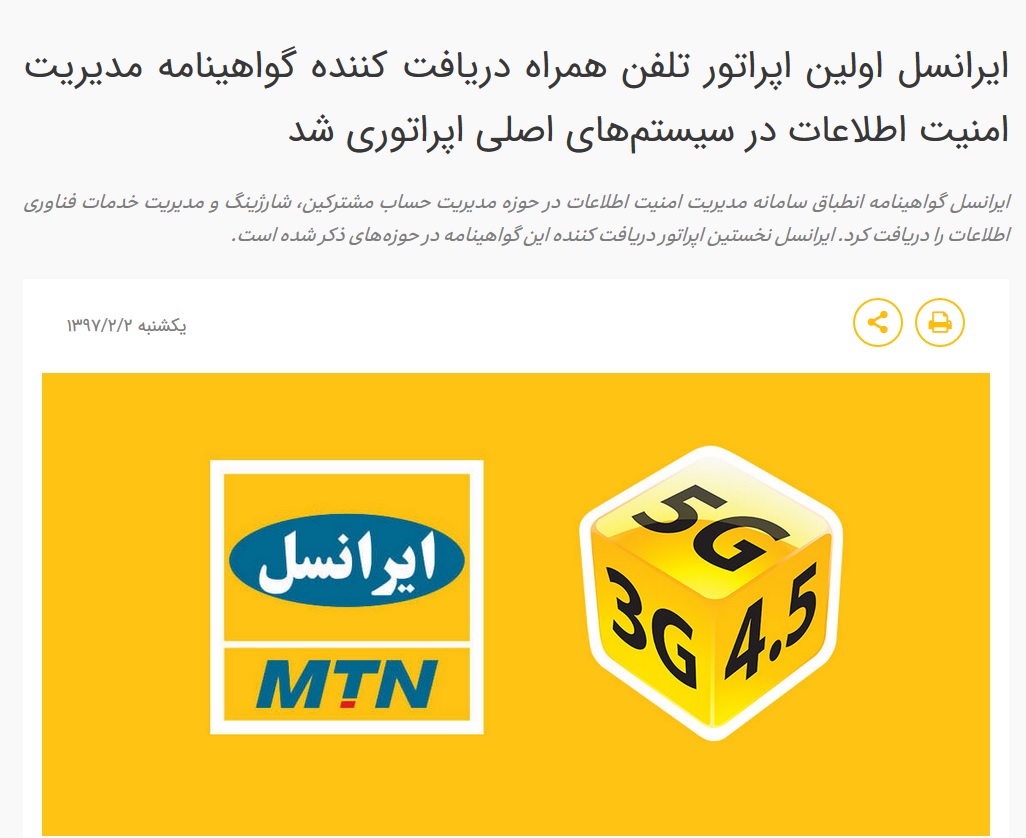 به گزارش خبرنگار سیتنا، روابط عمومی ایرانسل در خبری که روز یکشنبه 1397/2/2 علاوه بر انتشار در خروجی سایتش در اختیار رسانه ها قرار داد، تاکید شده بود که "ایرانسل به عنوان تنها اپراتور تلفن همراه کشور گواهینامه نظام امنیت اطلاعات (نما) را دریافت کرد".
