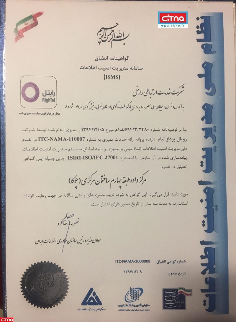 در پی انتشار این ادعا، تصویر دریافت گواهینامه انطباق سامانه مدیریت امنیت اطلاعات توسط رایتل در تاریخ 1394/12/9 یعنی بیش از دو سال قبل از ایرانسل، توسط سیتنا منتشر شد. (لینک)