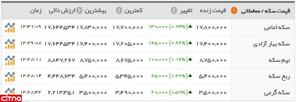 بر این اساس، قیمت سکه تمام بهار آزادی امروز در بازار یک میلیون و 740 هزار تومان، نیمسکه 875 هزار تومان، ربعسکه 540 هزار تومان و سکه یکگرمی 350 هزار تومان است.