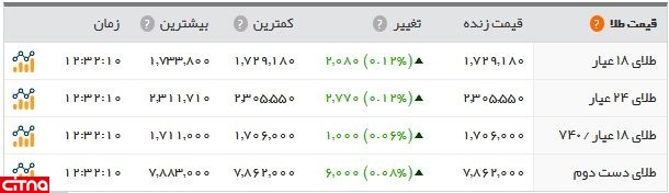 همچنین قیمت طلای 18 عیار در بازار بالا رفت؛ به طوری که طلای 18 عیار با قیمت 172 هزار و 918 تومان به فروش رفت.