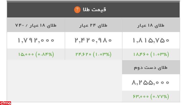 هر مثقال طلا با 8 هزار تومان افزایش به قیمت 786 هزار و 500 تومان رسید. هر گرم طلای 18 عیار هم 181 هزار و 575 تومان شد.