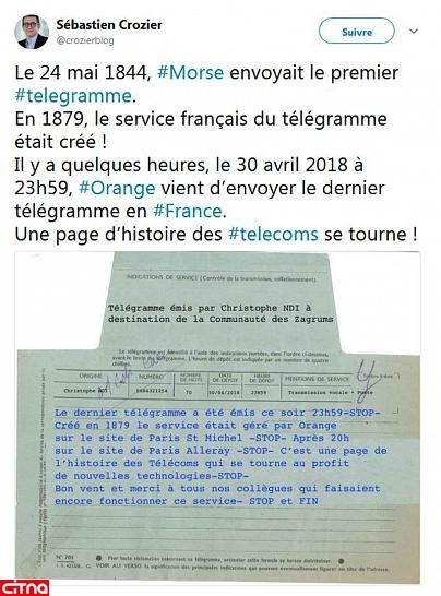 به گزارش سیتنا، اپراتور اورنج در ساعت ۲۳ و ۵۹ دقیقه دوشنبه شب آخرین تلگرام را ارسال کرد و آخرین برگ کتاب تاریخ ۱۳۹ ساله آن را در فرانسه بست.