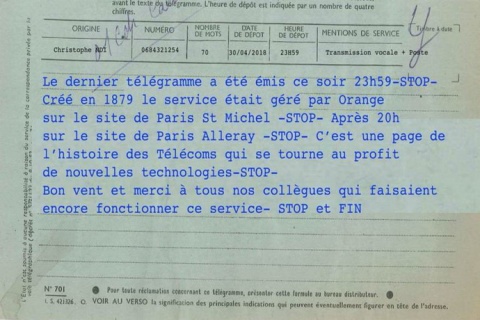 آخرین تلگرام اپراتور اورنج خطاب به کارکنان این شرکت نوشته شده است. آن گونه که یک کارشناس ارتباطات در توئیتر خود منتشر کرده، متن این تگرام بدین شرح است: «آخرین تلگرام امشب ساعت ۲۳:۵۹ ارسال شد-تمام-این خدمت در سال ۱۸۷۹ توسط شرکت اورنج و در مرکز سن میشل پاریس راهاندازی شد-تمام» پیامی که حاکی از یک نوستالژی است. «این یک برگ از تاریخ ارتباطات است که به نفع تکنولوژیهای جدید ورق خورد-تمام-و عرض تشکر و خسته نباشید به همه همکارانی که در ارائه این خدمت تلاش کردند-تمام و پایان»