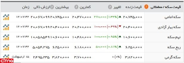 به این ترتیب، هر قطعه سکه تمام بهار آزادی با قیمت 2 میلیون و 40 هزار تومان، نیمسکه یک میلیون و 60 هزار تومان، ربعسکه 625 هزار تومان و سکه یکگرمی 382 هزار تومان به فروش رفت.