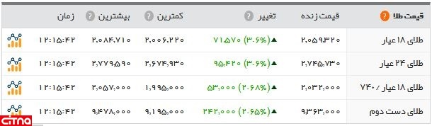 از سوی دیگر، قیمت هر گرم طلای 18عیار 7 هزار و 157 تومان افزایش یافت و با قیمت 205 هزار و 932 تومان فروخته شد. هر مثقال طلا نیز 892 هزار تومان است.