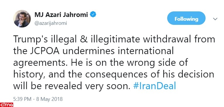 خروج غیر قانونی و نامشروع ترامپ از برجام نشان دهنده نادیده گرفتن توافقنامههای بینالمللی است. او در سوی اشتباه تاریخ ایستاده و پیامدهای تصمیم او به زودی آشکار میشود.