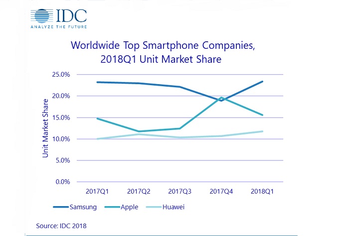 سیتنا - بر مبنای آخرین گزارش IDC به عنوان سازمانی معتبر در حوزه تحقیقات بازار در دنیا، سهم بازار هوآوی در بازار جهانی گوشی های هوشمند در سه ماهه اول سال 2018 به میزان 10 درصد نسبت به سه ماهه قبل رشد یافته و به میزان 11.8 درصد رسیده است. این اولین بار است که هوآوی موفق شده سهم بازار جهانی 11 درصد را در گزارش های IDC پشت سر بگذارد و نزدیک به 12 درصد شود.