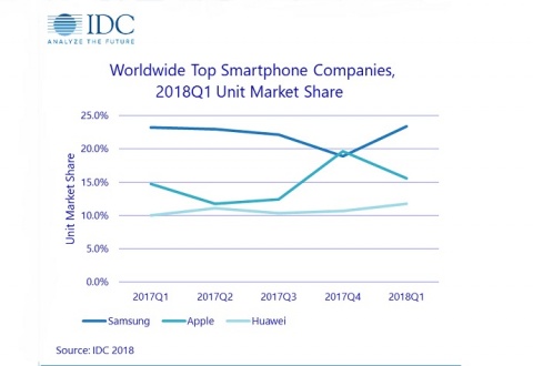 Huawei مدتی است در بازار جهانی موفق به رشد و کسب سهم بازار بیشتر به صورت متداوم شده و این امر در سه ماهه اول سال 2018 هم ادامه یافته است.