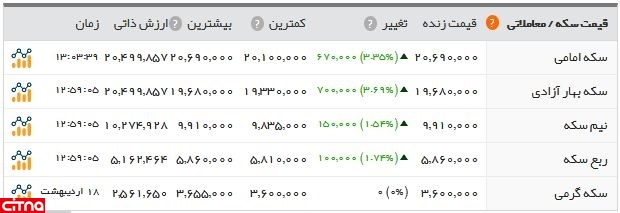 به این ترتیب، سکه امامی در بازار 2 میلیون و 69 هزار تومان، سکه تمام بهار آزادی یک میلیون و 968 هزار تومان، نیمسکه 991 هزار تومان، ربعسکه 586 هزار تومان و سکه یکگرمی 360 هزار تومان بود.