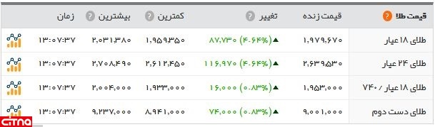 طلای 18عیار نیز با افزایش 8 هزار و 773 تومانی مواجه شد؛ به طوری که با قیمت 197 هزار و 967 تومان به فروش میرود. هر مثقال طلا نیز 857 هزار و 700 تومان بود.