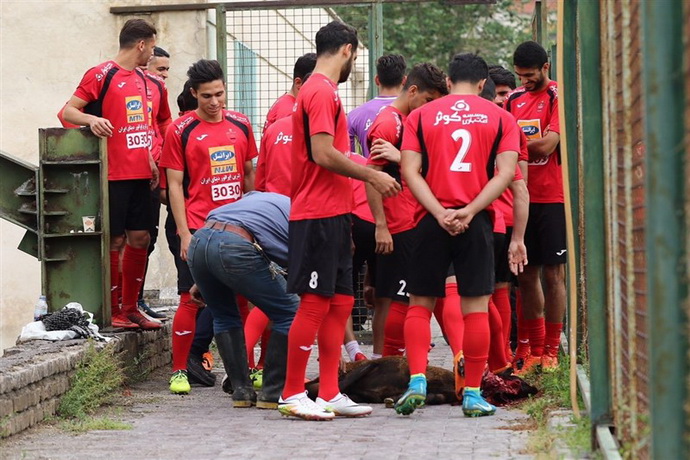 *در ابتدای تمرین با توجه به مصدومیت شدید چند بازیکن پرسپولیس در اواخر فصل، گوسفندی قربانی شد.