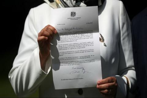خانم می در نامه عذرخواهی خود عنوان کرده که بریتانیا اطلاعات این زوج را با هم پیمانان بینالمللی خود به اشتراک گذاشته بود.