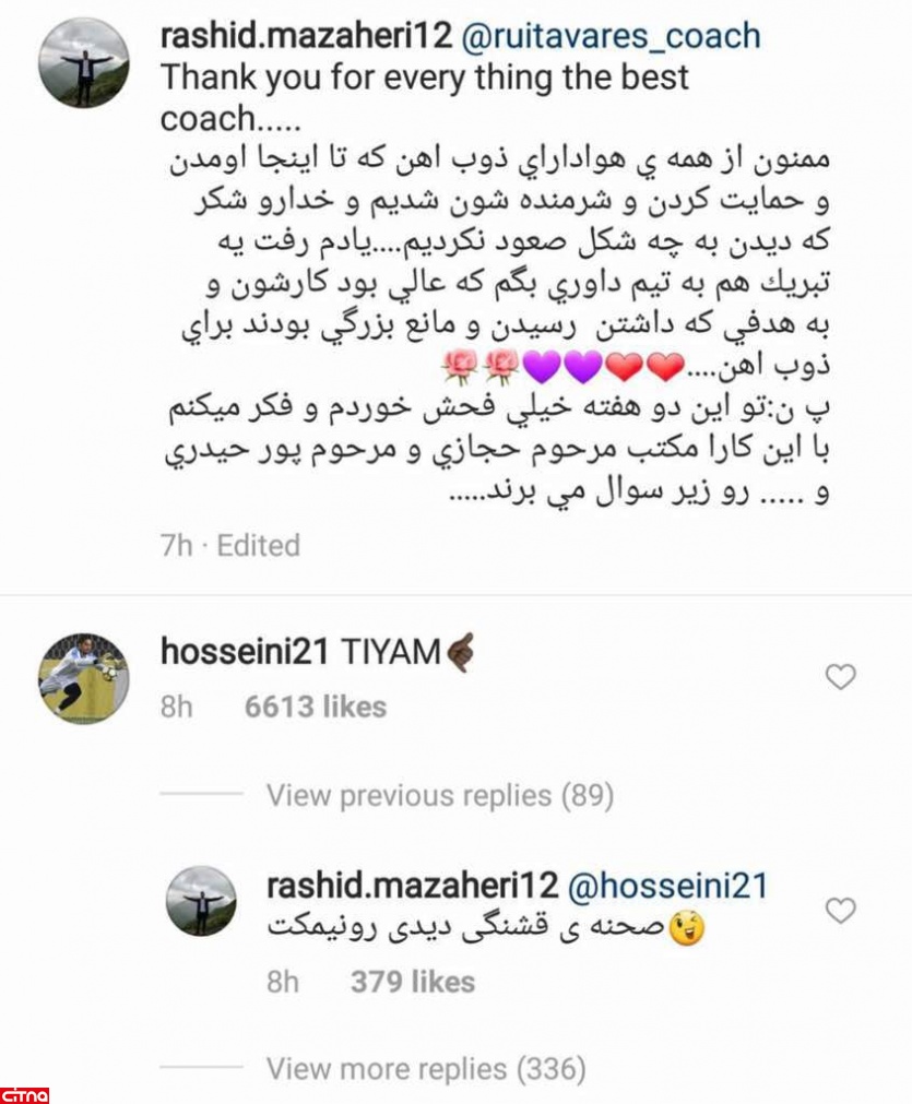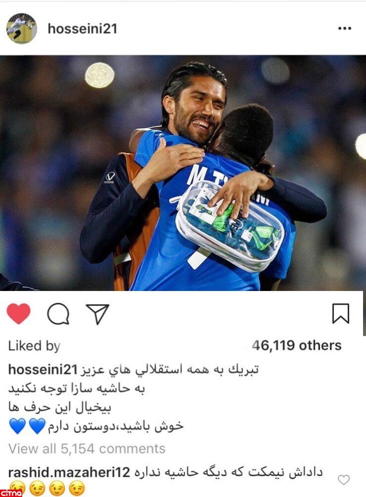 ساعتی بعد از این پست، سیدحسین تصویری از خودش و مامه تیام که در حال شادی صعود توام بود را به همراه متنی از بی توجهی به حاشیه سازان منتشر کرد که مهدی رحمتی رقیب او در استقلال با انتشار کامنتی برای هم تیمی جوان تر و شیرازی خود آرزوی موفقیت در جام جهانی و عرصه ملی کرد، کامنتی که در ادامه با حرکت محمدرشید مظاهری گلر ذوبی ها روبرو شد او این بار در مقابل کامنتی که سیدحسین زیر پست او گذاشته بود نوشت: "نیمکت نشینی دیگه حاشیه ای نداره سیدجان"! مظاهری که برای رسیدن به فهرست نهایی جام جهانی با حسینی رقابت نزدیکی دارد با نوشتن این متن هم به نیمکت نشینی رقیب استقلالی خود طعنه زد هم سعی کرد پاسخی به جنگ روانی رقیب خود در تیم ملی بدهد و به نوعی در این کل کل بازنده نباشد.