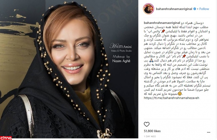 بهاره رهنما بازیگر سینما و صدا و سیما از معدود بازیگرانی است که بعد از فیلتر شدن تلگرام، یک اپلیکیشن جایگزین را به طرفدارانش معرفی کرد.