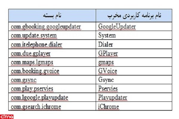 در جدول زیر فهرستی از نام برنامههای کاربردی مخرب به همراه نام بسته آنها مشاهده میشود.