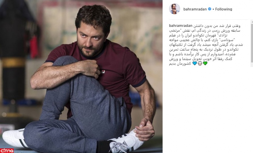 به گزارش سرویس وبگردی سیتنا، بهرام رادان که این روزها مشغول بازی در نقش یک تکواندوکار در فیلم «سونامی» است، در اینستاگرام نوشت: