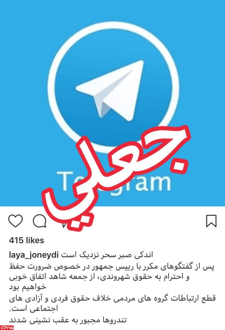 قابل ذکر است، در اینستاگرام صفحه جعلی به نام لعیا جنیدی معاون حقوقی رئیسجمهور از قول وی مدعی شده که به زودی از تلگرام رفع فیلتر میشود.