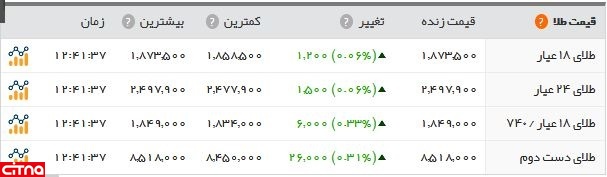از سوی دیگر، قیمت طلای ۱۸عیار در بازار بالا رفت؛ به طوری که با قیمت ۱۸۷ هزار و ۳۵۰ تومان به فروش رفت. هر مثقال طلا نیز ۸۱۱ هزار تومان بود.