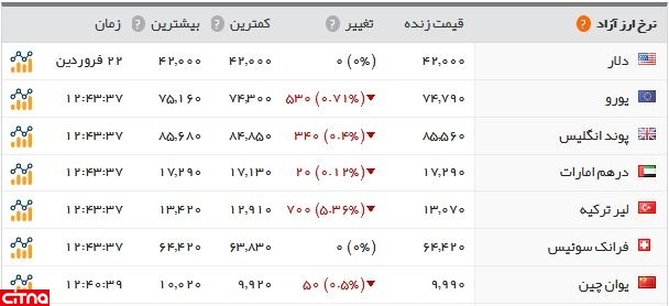 در بازار ارز اما قیمتها نزولی بود. نرخ یورو ۵۳ تومان، پوند ۳۴ تومان، درهم امارات ۲ تومان، لیر ترکیه ۷۰ تومان و یوان چین ۵ تومان کاهش یافت.