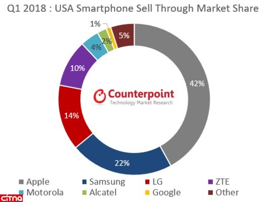 این آمار و ارقام که بر اساس میزان فروش واقعی گوشیهای هوشمند در ایالات متحده آمریکا ثبت شده و سپس مورد تحلیل قرار گرفته است، نشان میدهد که در سه ماهه آغازین و نخست سال جاری ۲۰۱۸ میلادی، مجموعا ۳۸.۷ میلیون دستگاه موبایل در این کشور به فروش رسیده است که اپل از این میزان تقریبا سهمی معادل ۴۲ درصد از بازار گوشیهای هوشمند را به خود اختصاص داده است.