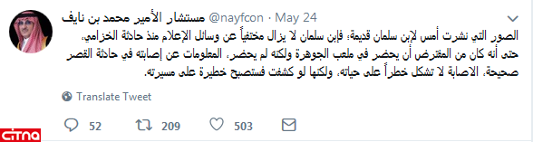 محمد بن نایف اعلام کرد تصاویری که دیروز از بن سلمان منتشر شده قدیمی است، بن سلمان از زمان حادثه منطقه الخزامی، هنوز در رسانه ها ظاهر نشده، قرار بود وی در ورزشگاه الجوهره حاضر شود اما حضور نیافت، اطلاعاتی که درباره زخمی شدن وی در حادثه مذکور منتشر شده صحیح است، زخم بن سلمان جان وی را تهدید نمی کند اما اگر زخمی شدن وی افشا شود، برای روند فعالیت وی خطرناک خواهد بود.