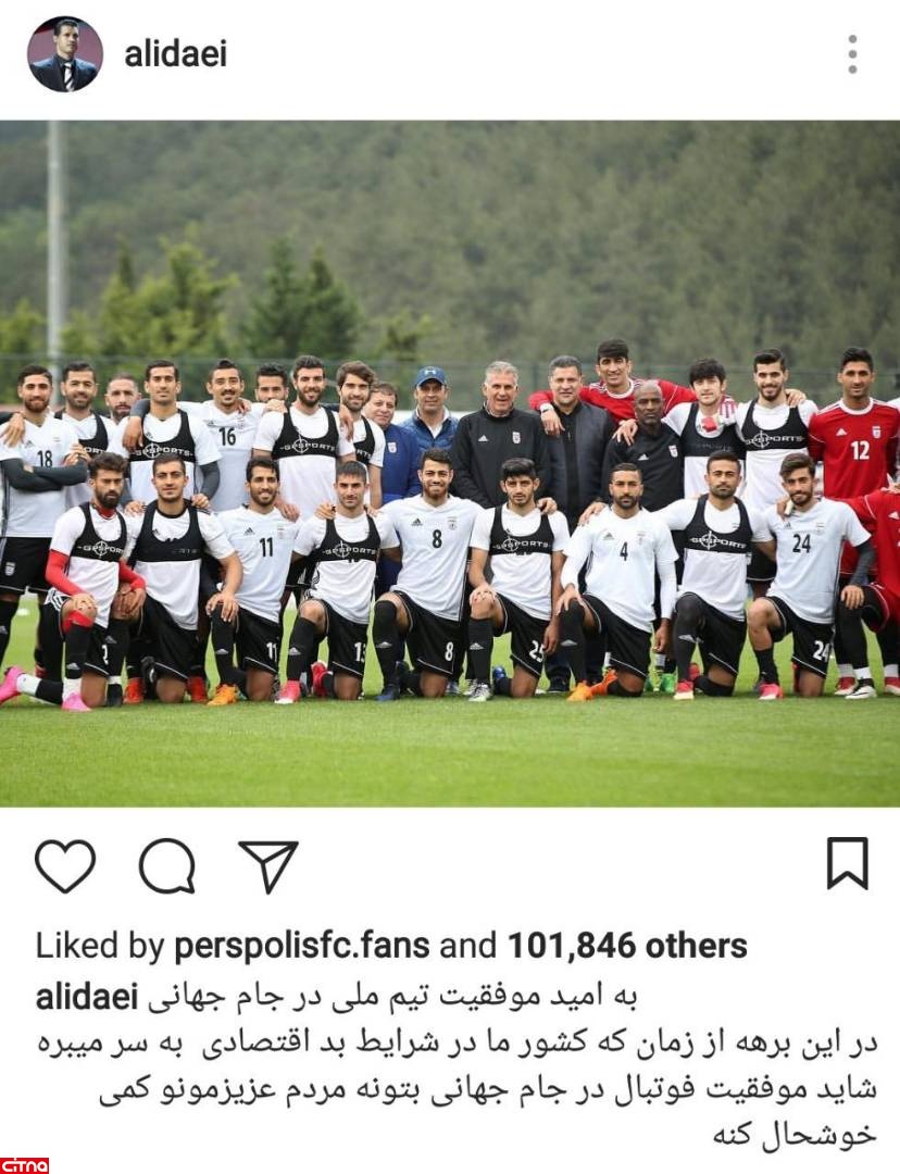 به گزارش سرویس وبگردی سیتنا، علی دایی که برای بالا بردن روحیه ملی پوشان ایران به اردوی انها در ترکیه سر زده بود با انتشار عکسی در صفحه اینستاگرام خود برای ملی پوشان ارزوی موفقیت کرد و نوشت: