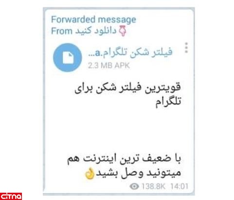 برنامه «فیلترشکن تلگرام» از جمله برنامههای آمادهای است که با توجه به کد آن، در مقاطع مختلف زمانی با عناوین مختلفی و برای سوءاستفادههای مختلف منتشر میشود. این برنامه توسط ۱۲ ضدویروس به عنوان بدافزار تشخیص داده شده و در تبلیغات گسترده در سطح تلگرام منتشر شده که نمونهای از آن در شکل زیر، با ۱۳۸ هزار بازدید قابل مشاهده است.