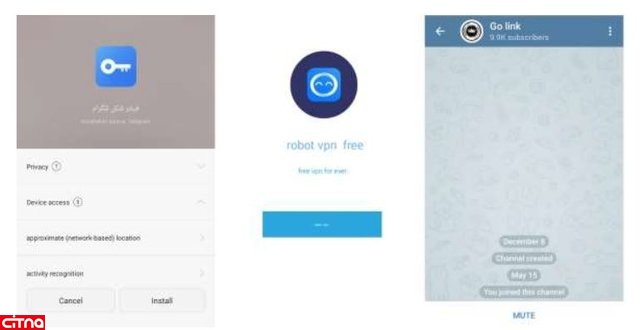 پس از نصب برنامه، ابتدا صفحه نشان دادهشده در شکل زیر به قربانی نشان داده میشود. پس از زدن دکمه شروع کانال golinkbot در تلگرام باز میشود. پس از آن آیکون برنامه حذف میشود و برنامه در پسزمینه فعالیت خود را ادامه میدهد.