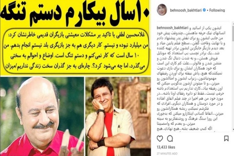 بختیاری در توضیح این سخنان نوشت: «ایشون یکی از اساتید و انسانهای نیک حرفه ما هستن، چندوقت پیش خود من جایی ایشون رو برای نقش پدر پیشنهاد دادم و با نهایت وقاحت گفتن سطح فیلم پایین میاد و بعد دیدم بازیگر جایگزین ایشون برادر تهیه کننده شد، یک برادر نچسب بی استعداد که موبایل فروش هستن و به شدت دنبال تگ شدن و منشن شدن و فالوئر.