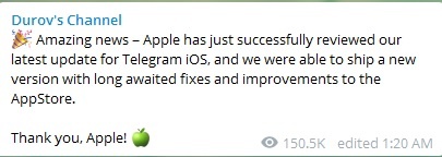 پاول دورف اعلام کرد: کاربران تلگرام میتوانند از نسخهی بروزرسانی شدهی این اپلیکیشن در اپ استور استفاده کنند.