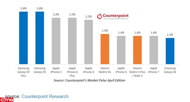 در این فهرست، سامسونگ با گلکسی اس ۹ و اس ۹ پلاس در جایگاههای اول و دوم قرار گرفتهاند و آیفون ۱۰، آیفون ۸ پلاس و آیفون ۸ به ترتیب در رتبههای سوم تا پنجم جدول جای گرفتند.