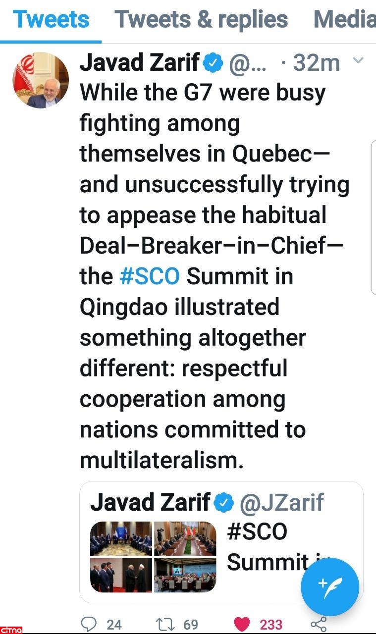 وزیر امور خارجه با انتشار توئیت هایی به مقایسه اجلاس سران سازمان شانگهای و نشست جی 7 پرداخت.