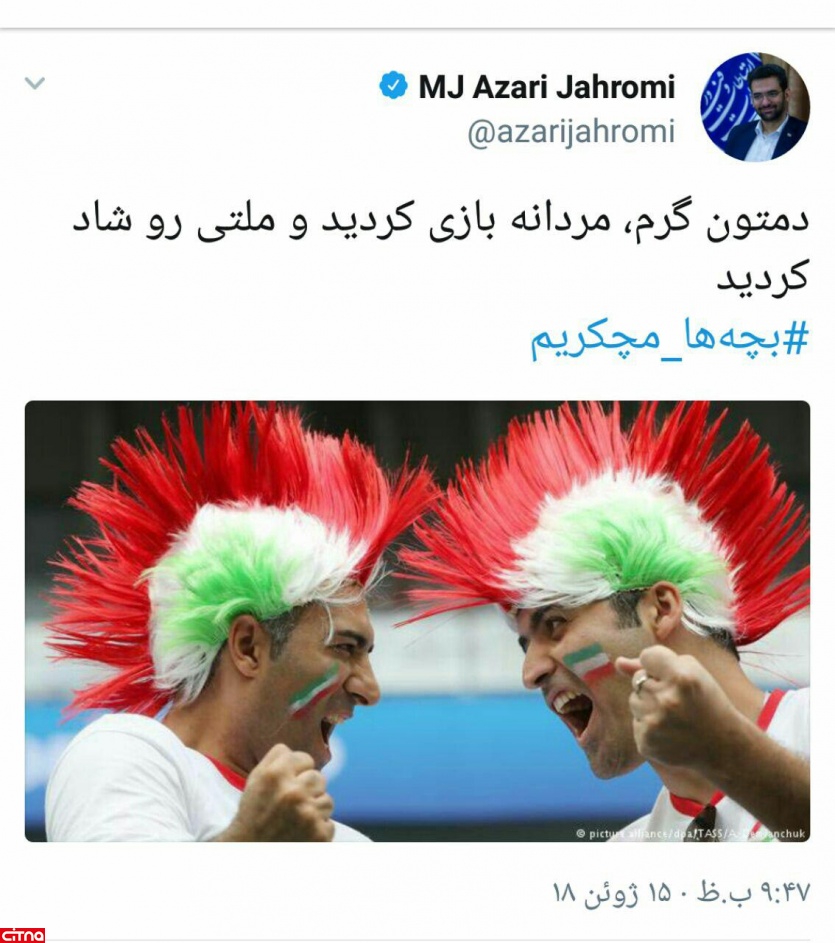 به گزارش سیتنا، مهندس آذری جهرمی به دنبال برد تیم ملی فوتبال کشورمان مقابل مراکش، با انتشار عکسی توئیت کرد: "دمتون گرم، مردانه بازی کردید و ملتی رو شاد کردید".