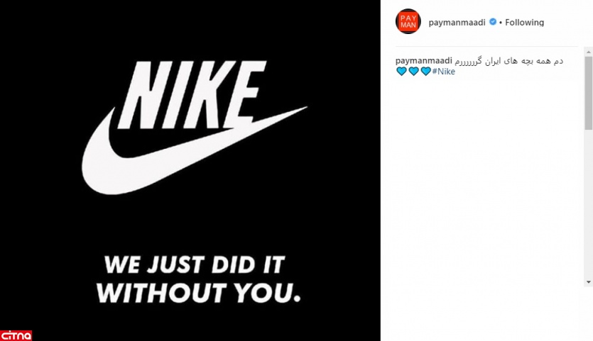 به گزارش سرویس وبگردی سیتنا، پیمان معادی تصویری که خطاب به کمپانی نایک روی آن نوشته شده است «ما انجامش دادیم بدون تو.» را در اینستاگرام منتشر کرد و نوشت: «دم همه بچه هاى ایران گرم.»