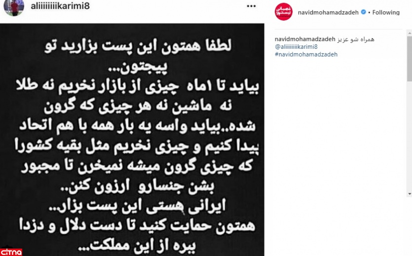 نوید محمدزاده پست اینستاگرامی علی کریمی که درباره گرانی قیمت کالاهای مختلف در چند ماه اخیر بود را در اینستاگرام منتشر کرد.