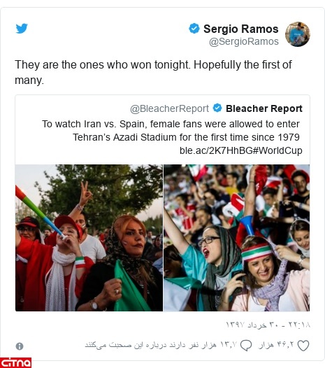 راموس با بازنشر توییتی که در آن به اولین حضور زنان در ورزشگاه اشاره شده، نوشت: آنها (زنان ایران) برندگان امشب هستند. امیدوارم چنین اتفاقی بارها بیفتد.