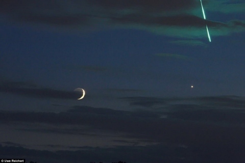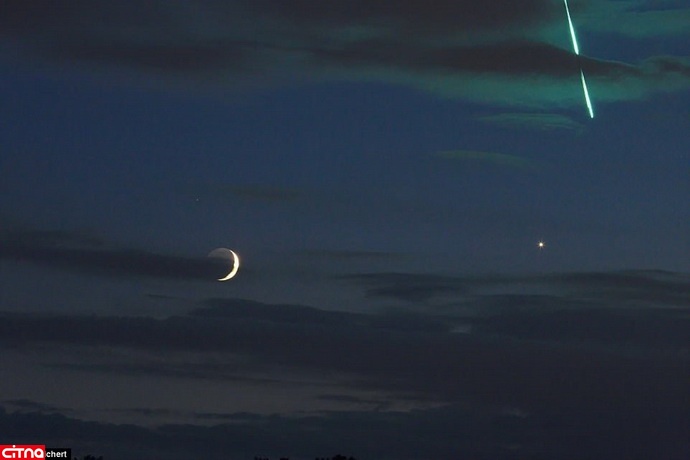 اما آنچه منجم آلمانی در منطقه هیدلبرگ، 16 ژوئن با لنز تله 100-400 گرفته، یک قاب عکس متفاوت از کنار هم قرارگرفتن ماه 3 روزه، ناهید و سنگ آسمانی با تم سبز است که در جو زمین میسوزد!