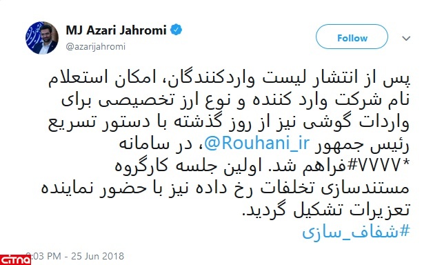 به گزارش سیتنا، به دنبال انتشار لیست واردکنندگان گوشی تلفن همراه که از ارز دولتی استفاده کرده اند توسط وزارت ارتباطات و فناوری اطلاعات، مهندس آذری جهرمی توئیت کرد: