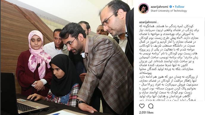 کودکان، ثمره زندگی ما هستند. همانگونه که برای زندگی در فضای واقعی تربیت مییابند، نیاز به آموزش برای بهرهمندی و مواجهه با فضای مجازی دارند. ۹ماه پیش طرح زیست بوم کودکان در فضای مجازی را آغاز کردیم و امروز در کمال مسرت در دانشگاه صنعتی شریف با کودکانی مواجه شدم که با فعالیت در یکی از زیر پروژه های زیست بوم کودکان با نام "برنامه نویسی به زبان مادری" برای برنامه نویسی، ساخت انیمیشن و نیز ساخت بازی توانمند شدهاند. این عزیزان اکنون نه تنها صرفا مصرف کننده فضای مجازیاند، بلکه به چرخه تولیدکنندگان محتوا پیوستهاند.